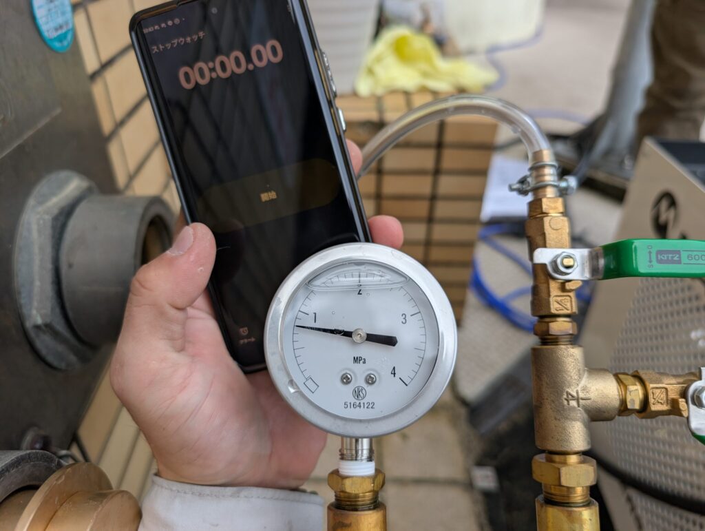 締切静水圧を3分間かけて確認します。(圧力かけっぱなしという意味です)