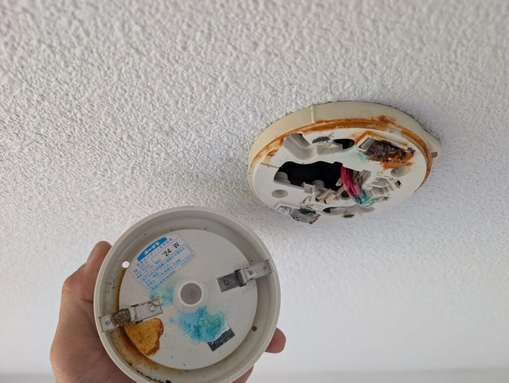 しかし、内部を確認すると、端子や電線にサビが見られました。エアコンの結露や湿度の影響が考えられます。